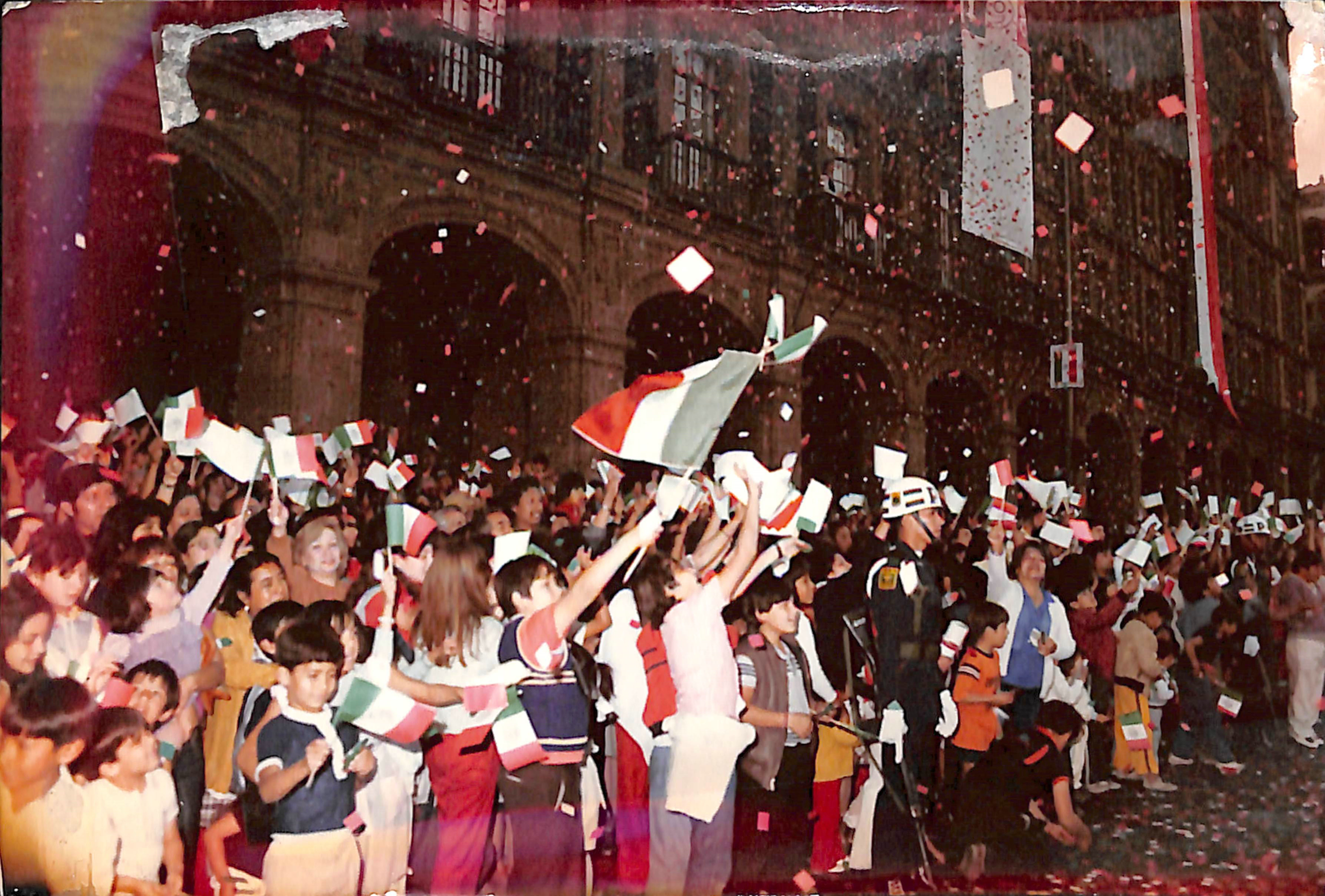 Fotografía en la que se observa al público asistente al desfile militar en la Plaza de la Constitución. Década de 1980.