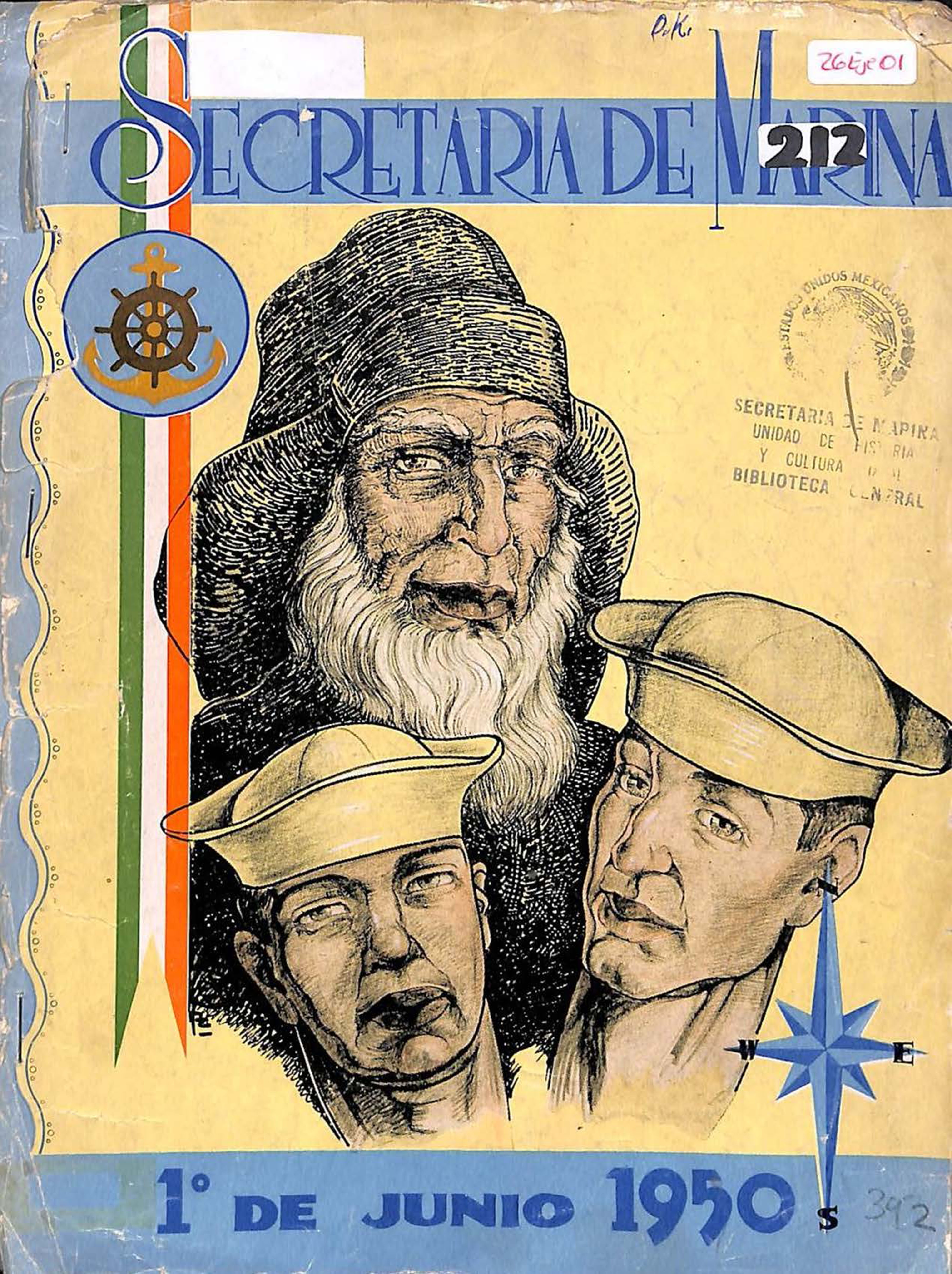 Cartel realizado por la Secretaría de Marina-Armada de México para la celebración del Día de la Marina, el día 1° de junio de 1950. Orientación vertical. Este cartel no se conserva en su formato original, fue extraído de la Revista de Marina del año de 1950, actualmente en resguardo de la Biblioteca Naval de la Dirección de Patrimonio Documental de la SEMAR