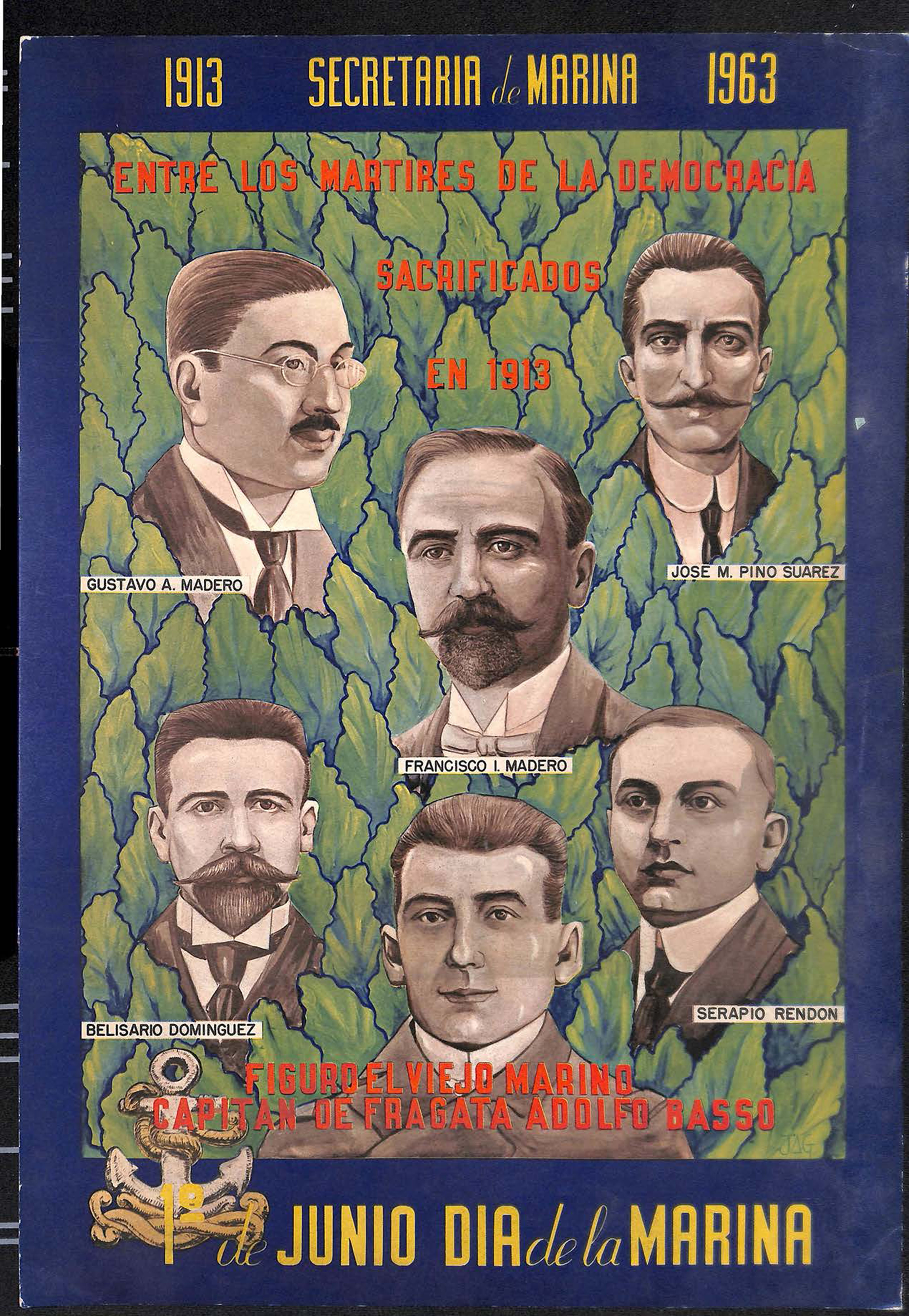 Cartel realizado por la Secretaría de Marina-Armada de México para la celebración del Día de la Marina, el día 1° de junio de 1963. Orientación vertical.
