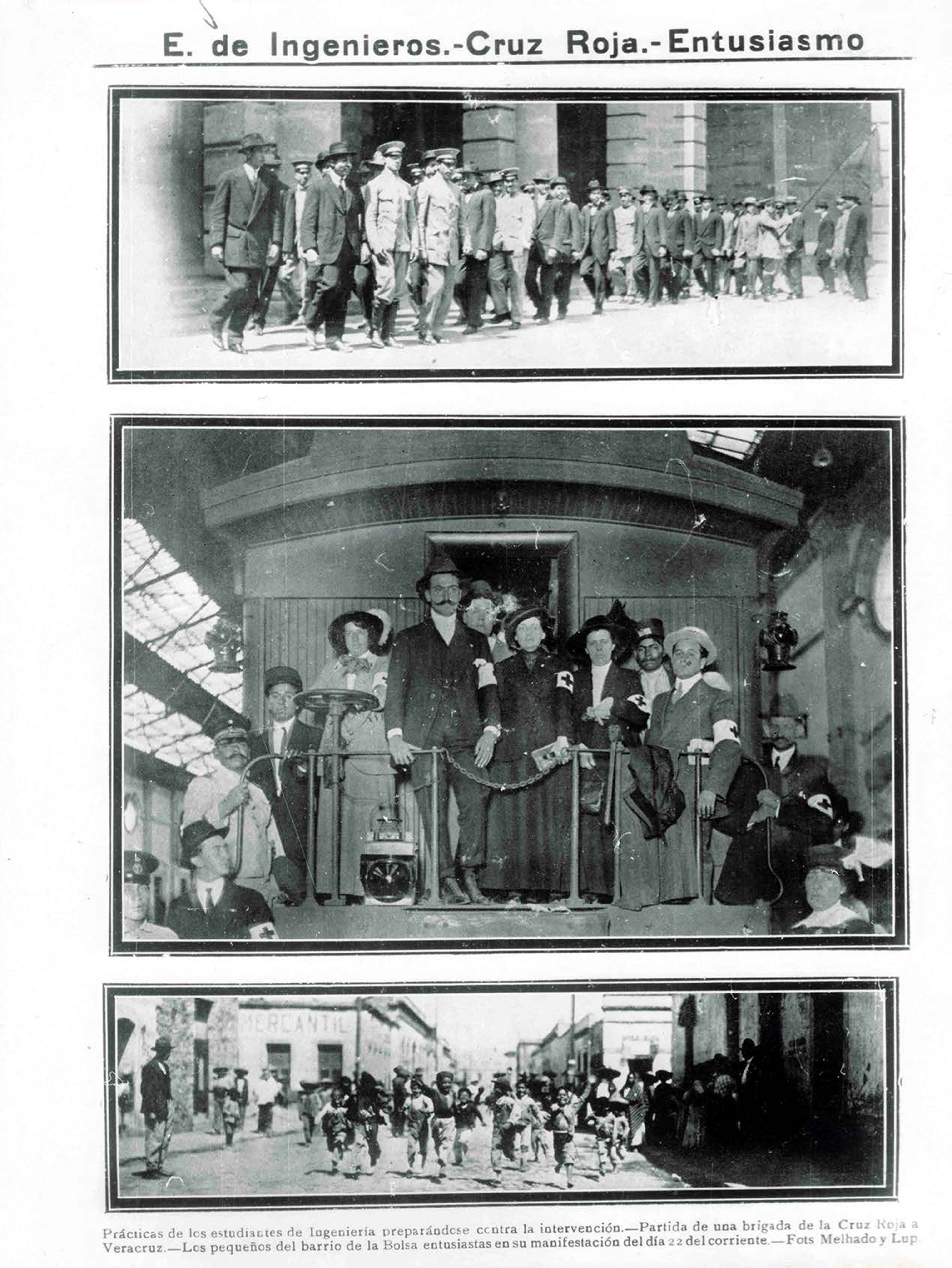 Estudiantes de ingeniería preparándose contra la invasión, partida de una brigada de la cruz roja a Veracruz, pequeños entusiastas en la manifestación del día 22.
